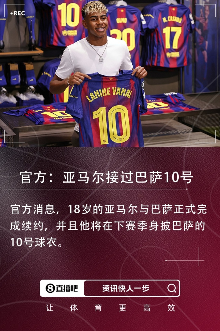 官方消息,18岁的亚马尔与巴萨正式完成续约,并且他将接过巴萨传奇般的10号球衣。